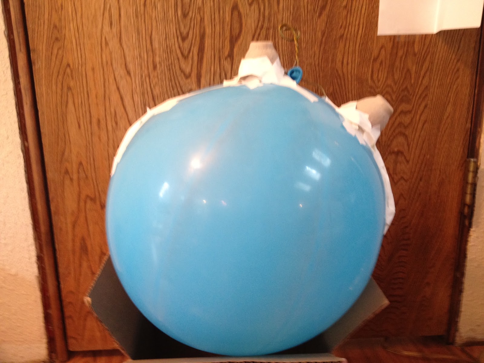 | HANGING DEVICE: Removing the paper roll from a dry cleaner hanger, I bent the hanger into a loop and taped it down the sides of the balloon |